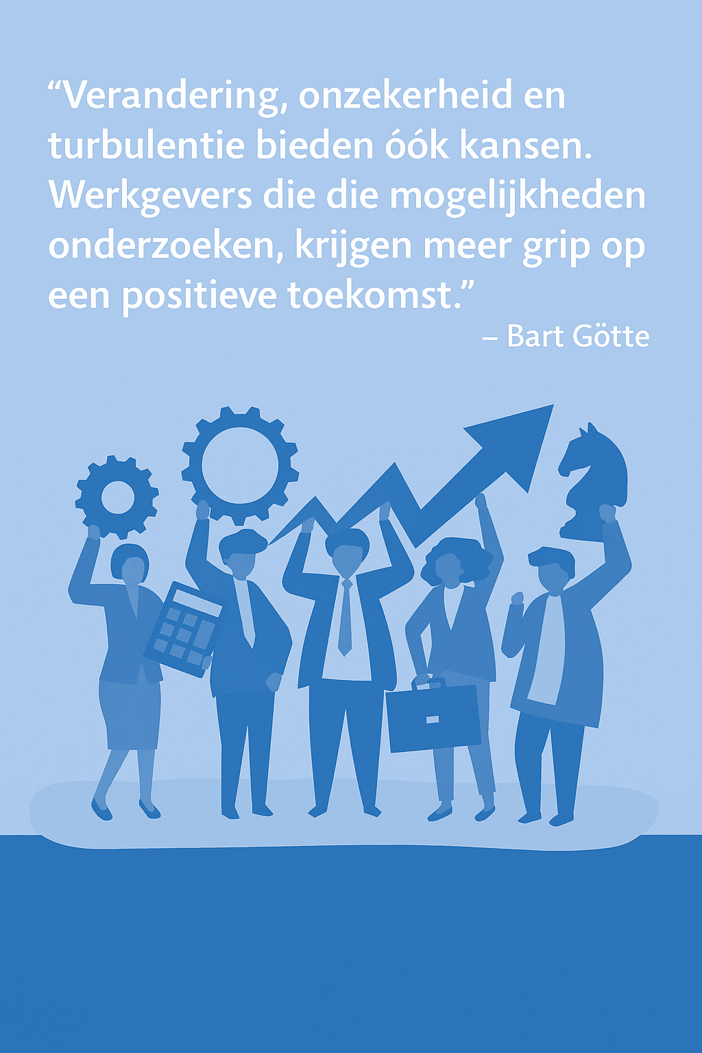 Voorspellingen zijn er niet om uit te komen, maar om op te vooruit te lopen, stelt Götte. Wat is zijn belangrijkste tip om de komende jaren zonder ongelukken door te komen? “De veranderingen zullen het ene bedrijf meer raken dan het andere. Maar vergeet niet: we hebben vaker tijden van verandering, onzekerheid en turbulentie gekend. En die bieden ook kansen en mogelijkheden. Ik zou werkgevers willen adviseren om die vooral te onderzoeken en te pakken. Dan krijgen we met z’n allen veel meer grip op een positieve toekomst dan wanneer we het ons maar laten overkomen.”