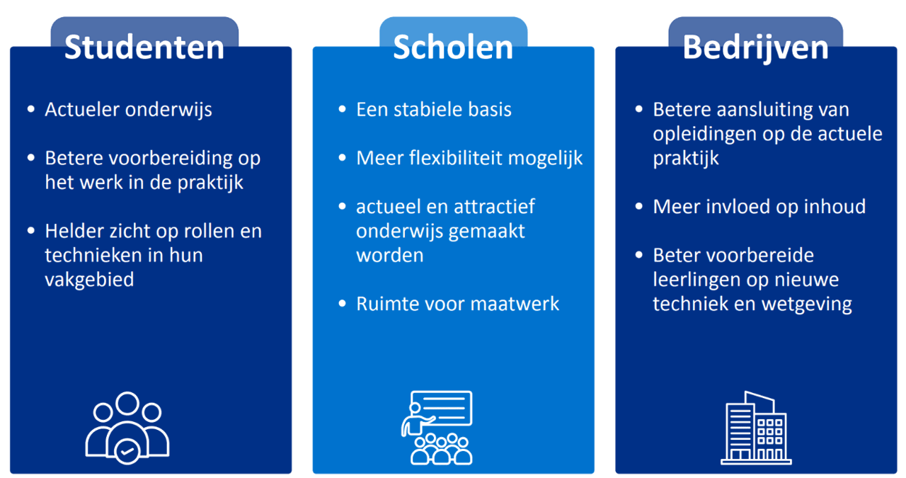 Hieronder is te zien wat de onderwijskwalificatie inhoudt voor studenten, scholen en bedrijven.