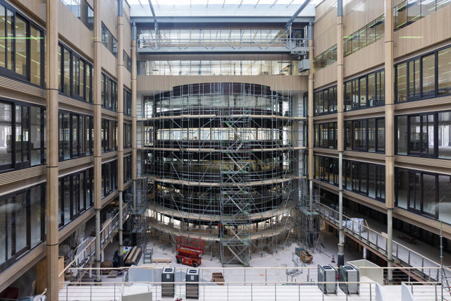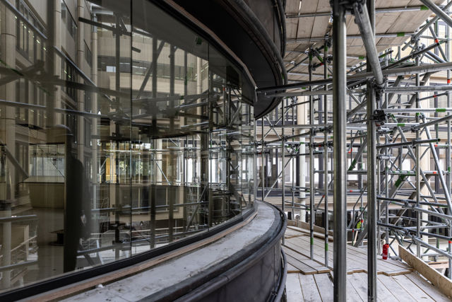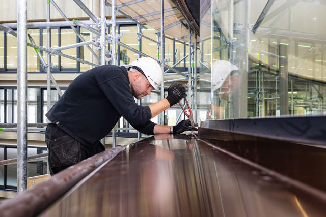We zijn nu bijvoorbeeld bezig bij een pand waar we de oude koperen voorgevel hebben gedemonteerd. Het pand is daarna uitgebreid met een nieuwe glazen gevel. We hebben het oude koper opgeslagen en nu, twee jaar later, monteren we dit binnen in het atrium terug op de oude buitengevel. Zo werken we waar mogelijk circulair. Overigens zijn koper, lood en zink ook materialen die grotendeels gerecycled kunnen worden, mocht men toch kiezen voor vervanging. Het verwerken en buigen van het materiaal doen we allemaal zelf in onze werkplaats. We laten niks prefab binnenkomen, het draait bij ons echt om vakmanschap.