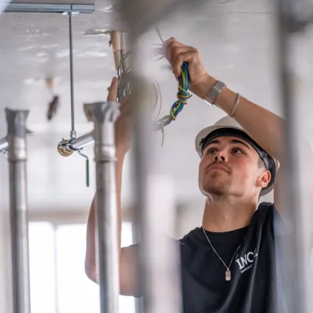 Elektrotechnicus Aiden Hartley is een van de jonge monteurs in opleiding bij INCO. “Je leert het meest als je in de praktijk ziet wat je doet. Dus zelf doen is voor mij superbelangrijk. En de theorie, die pik ik wel op school op, of hier. Het leuke van INCOllege vind ik dat je ook wat meekrijgt van de andere disciplines, want we doen hier zowel elektrotechnische als werktuigbouwkundige installaties. Dan weet je ook wat je collega’s allemaal aan het doen zijn. We doen het uiteindelijk samen.”