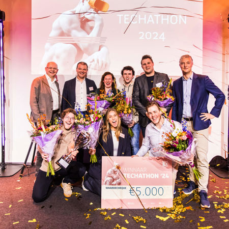 Na de bekendmaking van het winnende team door de juryvoorzitter kon algemeen directeur Erik van Engelen van Techniek Nederland de captain van team Kuijpers/Hogeschool van Amsterdam/Avans Hogeschool/Koning Willem I College de beker én een cheque van 5000 euro overhandigen. Techathon ‘24 krijgt nog een vervolg. Alle deelnemende teams presenteren hun plannen binnenkort bij Techniek Nederland en de gemeente Woerden.