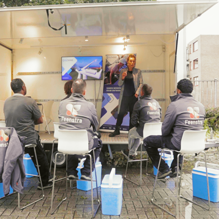 Zo kwam de Vakbus langs bij Feenstra in Capelle a/d IJssel en konden hun medewerkers op 1,5 m van elkaar weer gebruik maken van de Vakbus en doorgaan met leren en ontwikkelen.