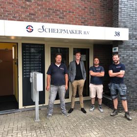 Souhail Aghattas werkte bij een koeriersdienst. Nu volgt hij via Onze Joost een leerwerktraject tot elektromonteur bij elektrotechnisch installatiebedrijf Scheepmaker. Foto: vlnr Duco van Veeren, Bart Dolstra, Souhail Aghattas en Cas van Veeren.